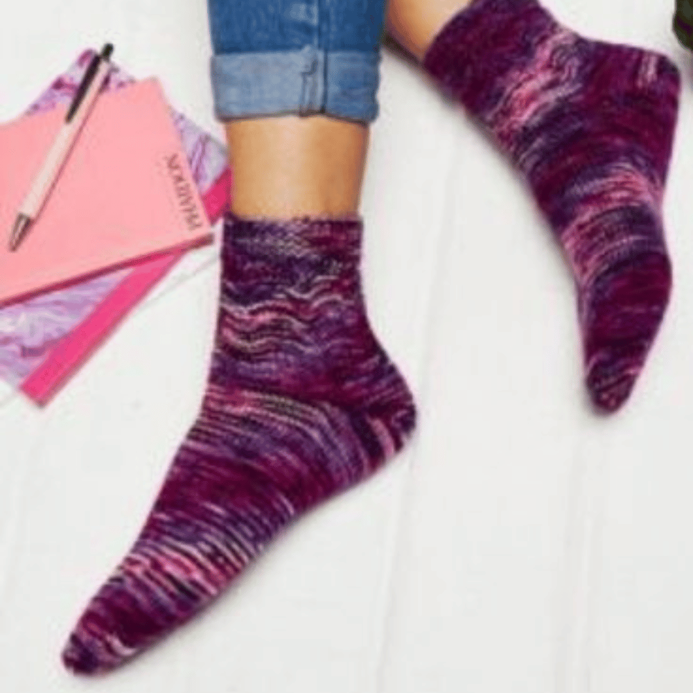 This sock is knitted in the round and includes a heal turn, and a mix of stocking stitch, ribbing and a lovely but simple to create chevron stitch. It uses Fair Trade Manos del Uruguay Alegria superwash yarn.