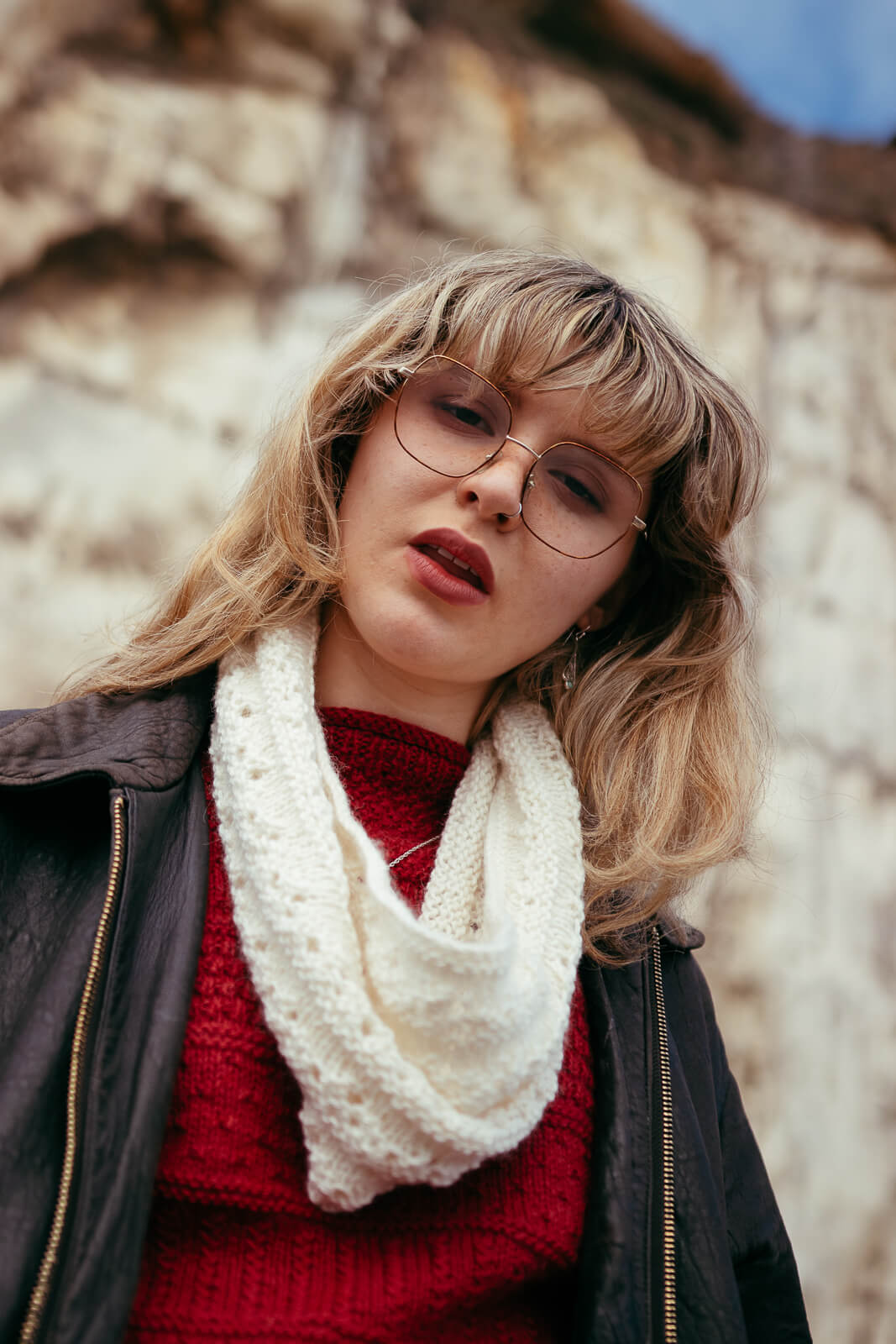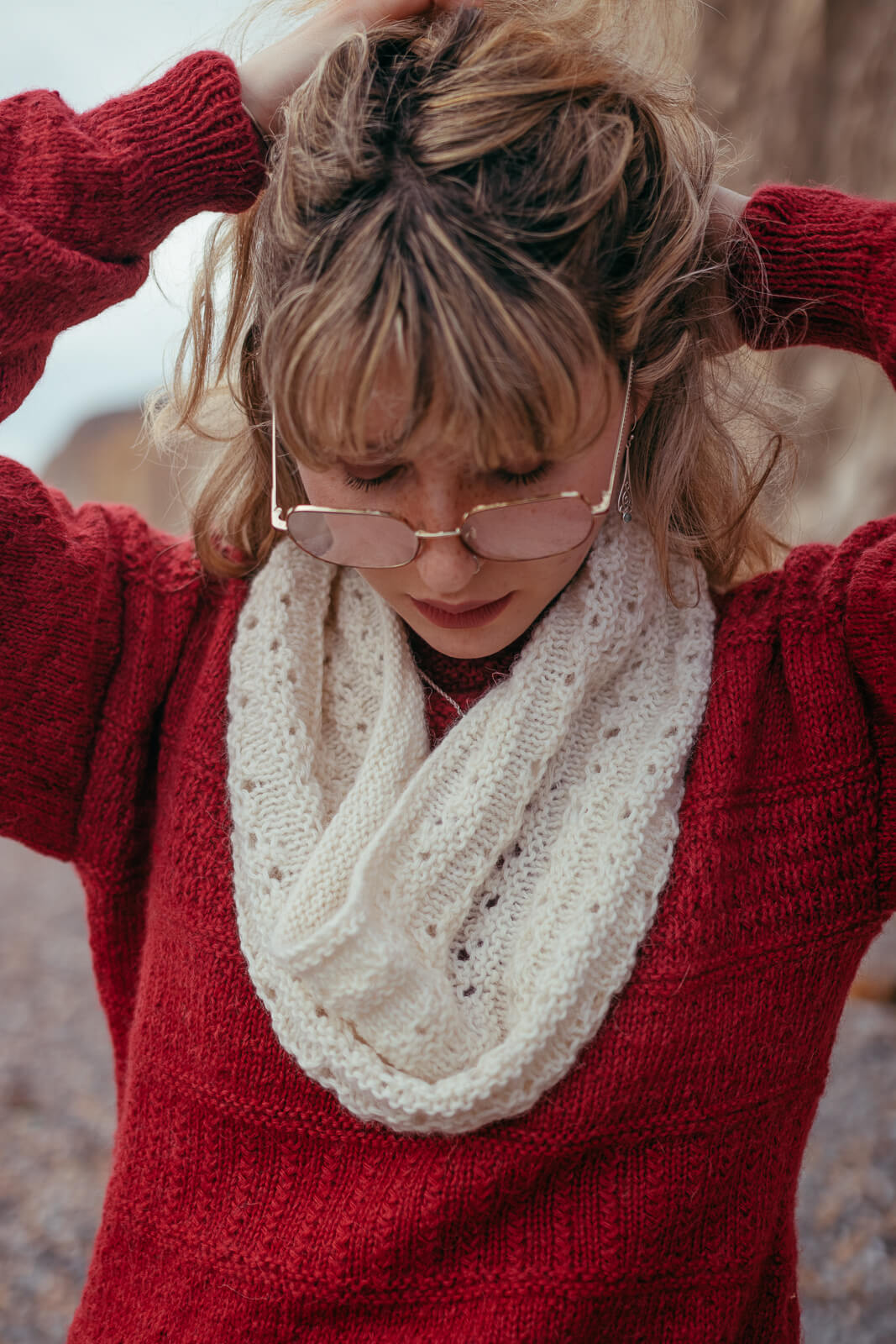 The cowl uses a great stitch: so easy, but so effective! Unusually, this is not a wraparound cowl but one we see held loosely in place with a lovely broach under a jacket or over a sweater to smarten the whole look up. So check out the colours and perhaps plan them with your winter coats.