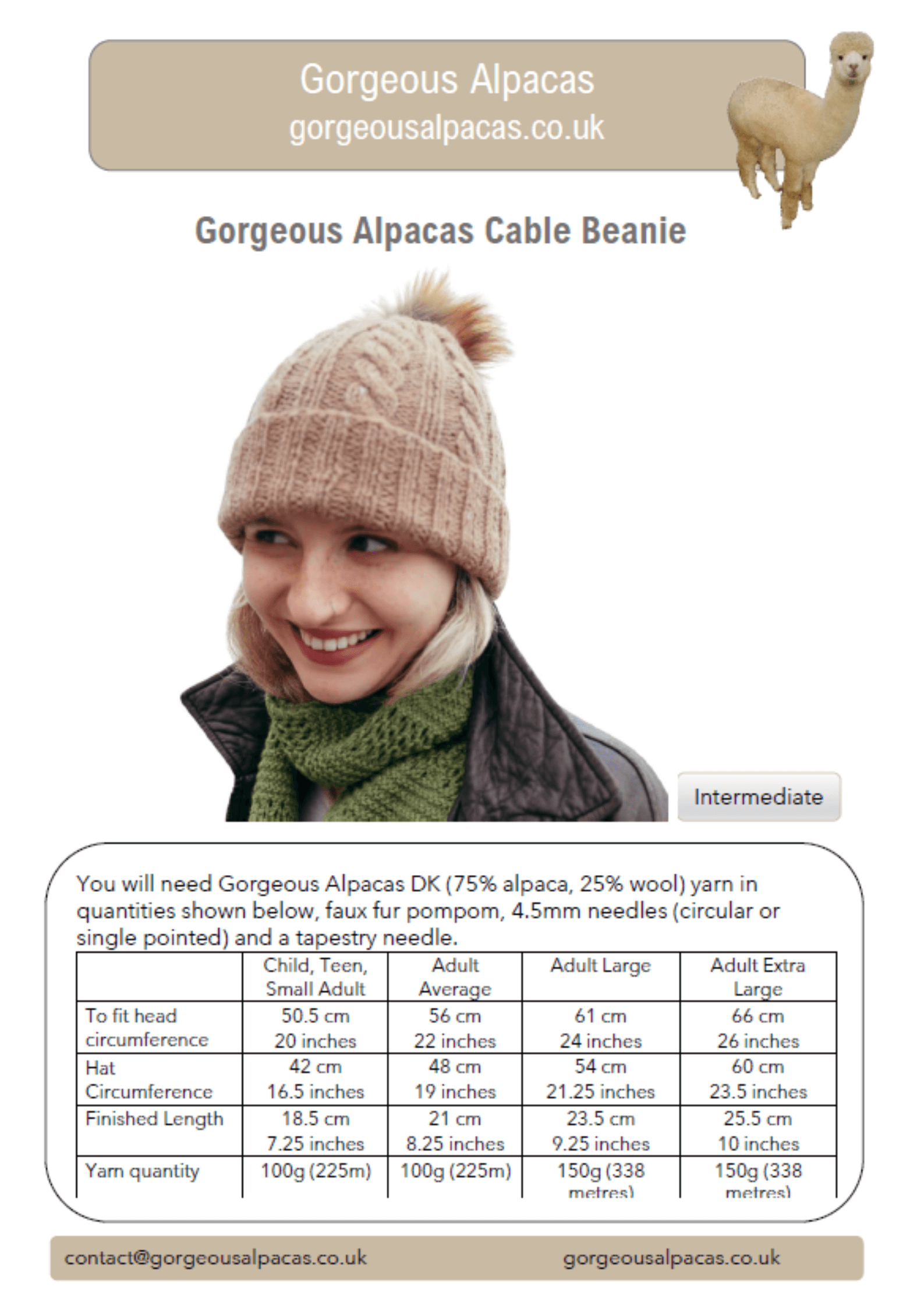 The pattern includes instructions for knitting in the round, or flat. We recommend matching this with 150g of our DK lightweight yarn, for which the tension 21 stitches and 27 rows over a 10cm square.