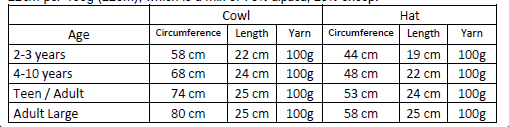 We recommend matching this with our DK lightweight yarn in any colour you love and 4.5mm needlesThe gauge recommended is 21 sts and 27 rows over a 10cm square. The amount you will need is 100g from the hat, and 100g for the cowl.