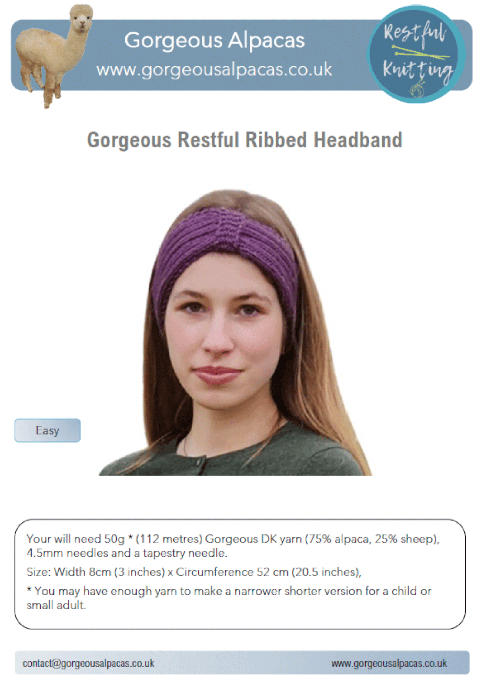 Part of our Restful range. We recommend matching this with 100g or 150g  of our DK lightweight yarn and 4.5mm needles. The gauge recommended is 21 sts and 27 rows over a 10cm square.